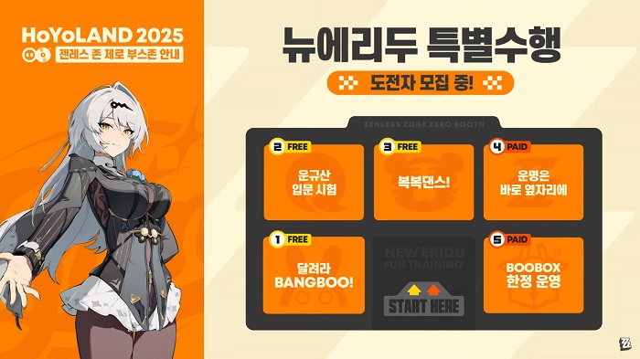 '젠레스 존 제로'의 테마는 '뉴에리두 특별 수행'이다. 시즌 2에서 그냥관의 새로운 수행자가 된 로프꾼들처럼 여러가지 트레이닝을 수행하는 미니게임을 준비하고 있다. 떨어지는 부적 봉을 잡는 의현 사부의 '운규산 입문 시험', 모션 영상에 맞춰 정확하게 댄스를 춰야 하는 굴복복 사저의 '복복댄스', 점프로 게이지의 불을 점등하는 '달려라 BANGBOO'는 무료로 체험하고 포토카드와 북마크를 수령할 수 있는 사양이며, 그 외에도 게임 내 캐릭터의 형상 시네마 이미지 또는 방부의 모습을 담은 키링 뽑기가 유료 이벤트 존으로 운영된다.