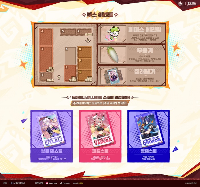 무료로 체험이 가능한 부스 이벤트는 플레이어 여행자 개개인의 성향을 기준으로 어울리는 나타 부족을 뽑아주는 '부족 테스트', 서핑보드 위에서 균형을 집는 밸런스 미션 '파도 수련', 화살 쏘기 체험을 할 수 있는 '명중 수련'이 있으며, 게임 내에서 가장 기초적인 식재료에 해당하는 '무뽑기'를 통해 랜덤 공식 굿즈를 획득하거나 '점괘뽑기'로 랜덤 포토 카드를 수집할 수 있는 유료 체험존도 운영한다.