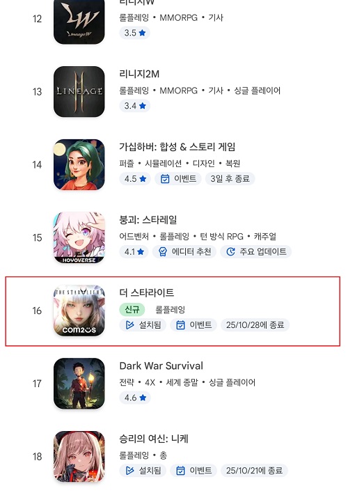 컴투스가 선보인 4세대 MMORPG '더 스타라이트'가 뒷심을 발휘해 구글플레이 스토어 매출 10위권에 안착했다.