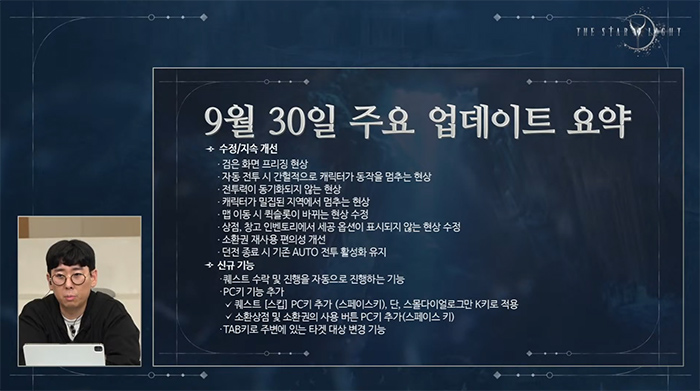 해당 방송에서는 매월 대규모 업데이트를 통해 이용자 피드백을 반영한다고 언급했으며, 10월에는 신규 성장 아이템 '아스터', 신규 지역 '부서진 대지', 신규 콘텐츠 '월드 던전'과 함께 '별의 낙원' 리뉴얼을 예고했다. 또 12월 중에는 다수의 길드 콘텐츠 및 편의성 개선을 위한 길드 2차 시스템 업데이트가 이뤄진다. 특히 신규 클래스 '란스'의 추가와 오프라인 모드 및 점령전 보스 모드 등의 다채로운 즐길거리도 선보일 예정이다.