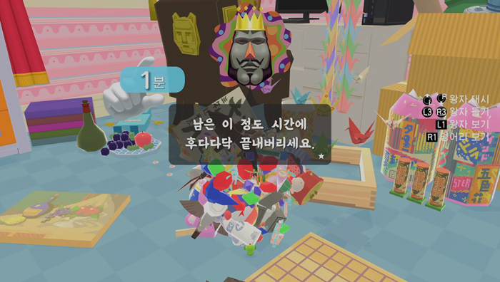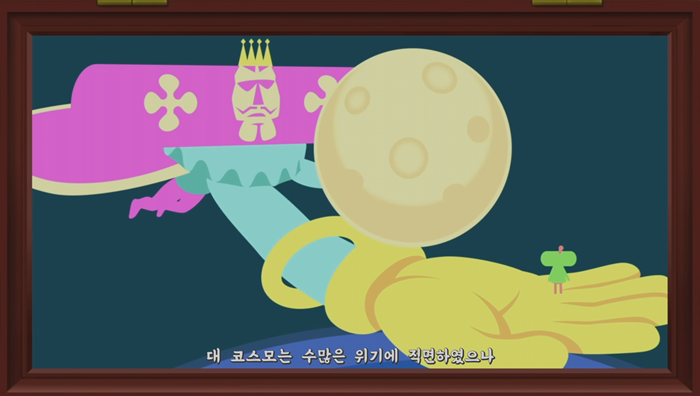 그나마 '왕자'는 아버지와 달리 무책임한 인간상은 아니어서인지 성실하게 덩어리를 굴리며 온갖 물건을 붙이고 키워 별들을 복구해내고 있습니다만 정작 사고를 친 당사자인 아바마마는 왕자한테 매번 시간 제한을 걸고 이런저런 조건을 붙이면서 간섭하고 미션을 완수하지 못하면 속을 박박 긁는 발언들을 쏟아냅니다.