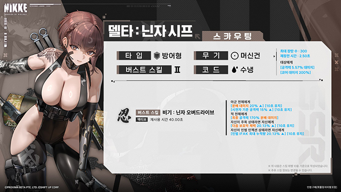 '델타 : 닌자 시프'는 '2버스트', '방어형'에 '머신건(MG)'을 사용하는 '수냉' 코드 니케로, 아군의 방어형 니케 유무에 따라 행동이 달라지는 독특한 기믹을 지녔으며, 아군의 분배 대미지 공격을 강화하며 버스트 스킬을 사용하면 아군의 공격 능력 및 자신의 생존 능력을 강화할 수 있는 니케입니다.