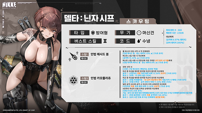 레벨인피니트가 서비스하고 시프트업이 개발한 미소녀 건슈팅 RPG '승리의 여신: 니케'가 10월 16일 업데이트로 새롭게 추가될 신규 SSR 니케 '델타 : 닌자 시프'의 스킬 정보를 공개했습니다.