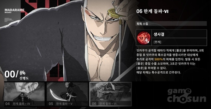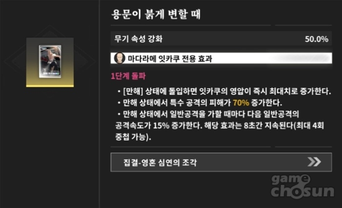 더군다나 원작에서도 잇카쿠의 만해 용문귀등환은 제대로 된 위력을 내기 위해서는 전투를 통한 예열 과정이 필요하여 슬로우 스타터 기질이 있다는 설정이 나오는데요. 앞서 소개한 적홍의 용문 패시브 효과는 일단 켜졌다면 스테이지가 끝날때까지 유지되기는 하지만 풀 포텐셜을 발휘하려면 최소한 만해를 2번 켜서 피니시를 날려야하는 식으로 원작을 재현하고 있기 때문에 다소 시간이 오래 걸리고 번거롭게 느껴질 수 있습니다.