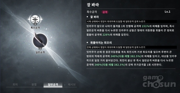 이쪽은 아예 회전격 하나만으로 필살기 수준의 피해가 나오고 평타를 재입력하여 나가는 추가 공격도 동일한 위력의 계수가 책정되어 있으며 필살기의 피니시 공격까지 들어가는 상황을 고려하면 한 사이클만에 다른 캐릭터 필살기 4회분의 피해량을 욱여넣는 것이 가능한 수준입니다.