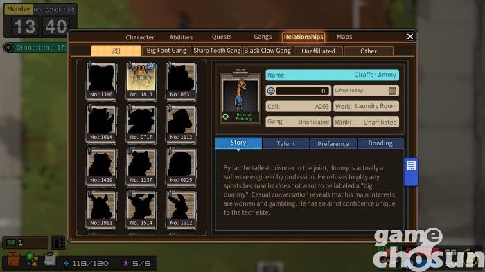 게임에는 다양한 성격을 가진 동물들이 나오며, 이들과 친하게 지내면 수감 생활이나 탈옥에 도움이 되는 재능과 아이템을 구할 수 있습니다. 실용적인 이유를 차치하고, 그들의 행동을 관찰하거나 이야기를 들어보는 것도 상당히 재밌죠. 다회차로 갈수록 이러한 즐거움은 희석되지만, 꽤 풍부한 이야기를 보장하니 2~3회차까진 꽤 재밌게 즐길 수 있습니다.