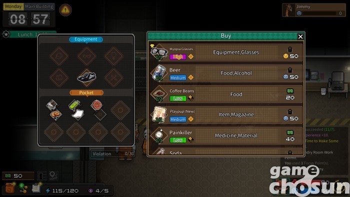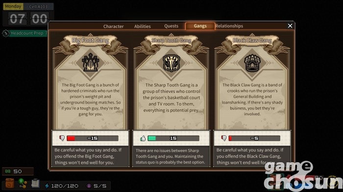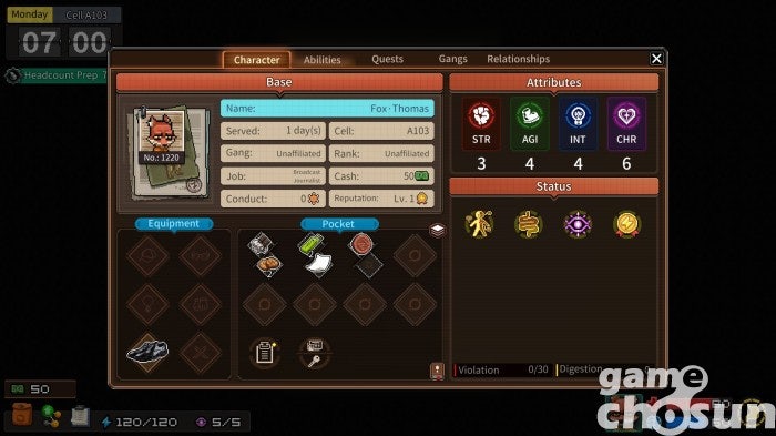 CRPG는 TRPG와 유사하다고 말씀드렸죠? 이 게임에도 캐릭터의 능력과 소지품 등을 나타내는 캐릭터 시트가 등장합니다. 여러분의 행동에 따라 토마스나 밥은 건강하고 똑똑한 수감자부터 멍청하고 골골대는 수감자까지 다양한 캐릭터로 거듭납니다.