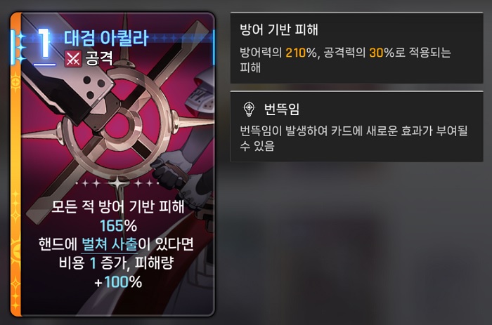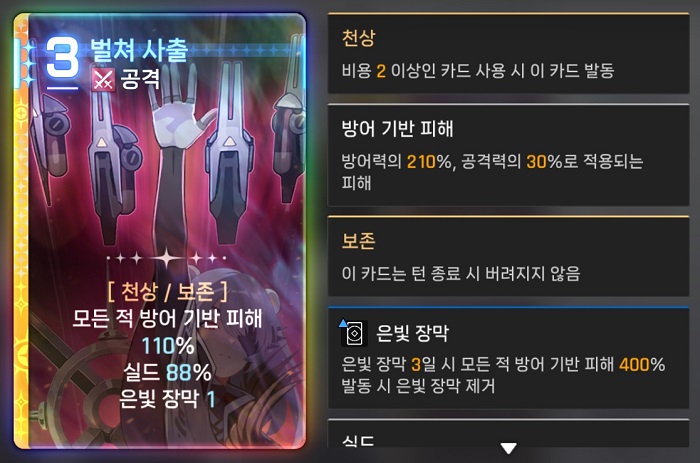 천상 및 보존이 디폴트인 벌쳐 사출은 대검 아퀼라와 마찬가지로 적 전체를 타겟으로 방어 기반 피해를 줍니다. 또 실드를 제공하며 '은빛 장막' 스택 1개를 쌓습니다. 천상 효과가 있는 만큼, 2코스트 카드를 사용하면 자동 연계되면서 발동합니다. 즉, 실질적인 코스트는 2인 셈.