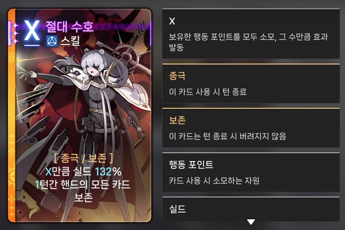종극 효과가 기본이기에 핸드에서 가장 마지막에 발동해야 합니다. 사용할 수 있는 코스트를 모두 소모하는 대신, 해당 코스트에 비례해 실드를 부여하며 핸드의 모든 카드를 보존할 수 있습니다. 따라서 다음 턴 준비를 위한 카드로 활용 가능합니다.