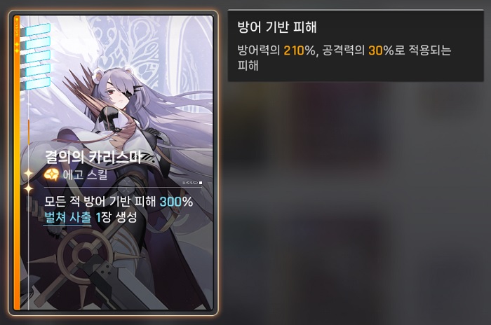 아울러 벌쳐 사출 등 일부 카드(번뜩임)에는 '은빛 장막'이라는 옵션이 포함돼 있는데, 은빛 장막은 칼리페의 고유 스택으로, 총 3개의 은빛 장막 스택을 쌓을 경우 모든 적에게 높은 계수의 방어 기반 피해를 줄 수 있죠.