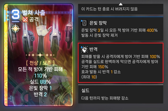 칼리페는 벌쳐 사출로 적 전체를 공격하면서 실드를 다량으로 수급해 다음 턴 적의 공격을 방어할 수 있는 형태로 설계돼 있으며, 공격 준비 단계에서는 절대 수호나 위압, 재집결 등의 카드로 버티게 되는데요. 이때 추천되는 능력은 바로 '반격'입니다.
