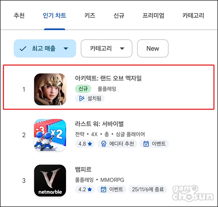 드림에이지의 MMORPG '아키텍트: 랜드 오브 엑자일'이 10월 30일 구글 플레이스토어 매출 순위 1위를 달성했다.
