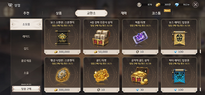 이벤트 교환소 아이템은 매일 3회 이벤트 소탕을 했다는 가정하에 모든 아이템을 구매할 수 있도록 되어 있으니 '경험치 북'을 제외한 모든 아이템을 우선적으로 교환한 후 모든 아이템 교환이 끝나면 이벤트 제작을 마치고 남은 포인트를 '경험치 북'으로 교환하면 됩니다. 특히, 일일 구매 물품은 매일 무조건 먼저 구매하셔야 합니다.