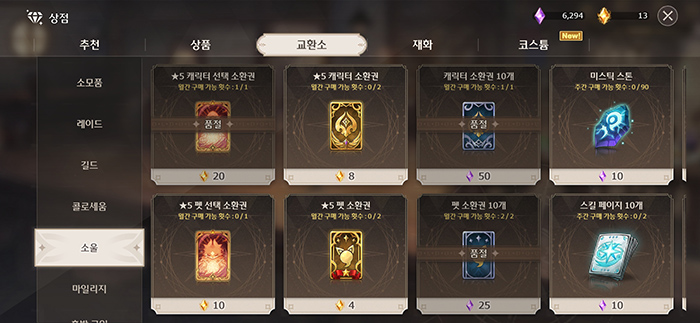 '소울' 교환소에서는 5성 중복을 획득한 레어 소울과 4성 이하 중복으로 획득한 소울로 아이템을 교환할 수 있습니다. 이곳에서는 '캐릭터 소환권'만 교환하는 것을 추천합니다.