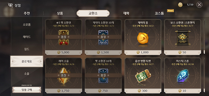 소울로는 '캐릭터 소환권'과 '펫 소환권'을 구매하시면 됩니다. 추가로 '미스틱 스톤'이나 '황금 나침반', '스킬 페이지'는 상황에 따라 구매해도 괜찮습니다. 그 외 나머지 아이템은 정말 필요하다면 구매하겠지만, 그다지 추천은 하지 않습니다.