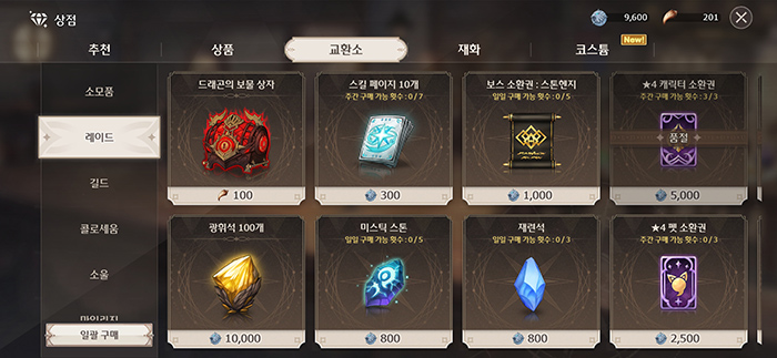 '레이드' 항목에서는 '레이드 코인'과 '드래곤 투스'로 아이템을 교환할 수 있습니다. 이는, 레이드와 파티 레이드 등에서 획득할 수 있는 재화인데요. 이곳의 아이템은 횟수 제한이 있는 아이템은 모두 구매하는 게 좋습니다.