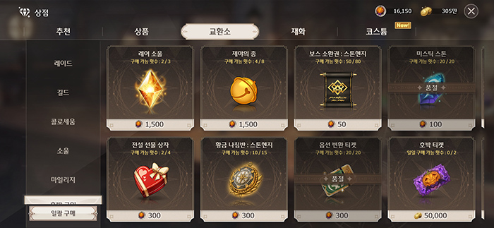 이곳의 아이템은 대부분 효율이 좋고, 길게 시즌 별로 판매하는 아이템도 존재하기에 대부분 구매하는 것이 좋습니다. 비교적 귀한 주간 구매 제한 물품 먼저 구매 후, 남는 포인트로 시즌 구매 제한 아이템을 구매하면 됩니다. 여기서도 '경험치 북'은 효율이 좋지 않아 교환은 추천하지 않습니다.
