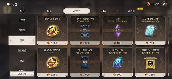 길드 교환소의 아이템은 초반에는 우선 '계승되는 운명'과 '계승되는 의지', '레이드 보스 입장권'을 제외한 모든 아이템은 모두 교환하는 것을 추천합니다.