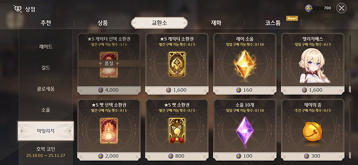 이후 마일리지는 '레어 소울'을 최우선으로 교환한 후, 소울 교환소에서 '5성 선택권'으로 교환하는 것이 효율이 좋습니다. '레어 소울'을 10개 사고도 충분하다면 그때 '5성 캐릭터 선택 소환권'과 '펫 소환권'을 교환하시면 됩니다.