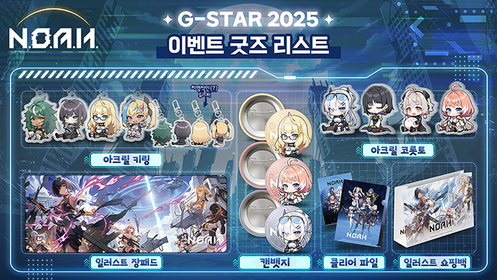 '노아'는 지스타 현장에서 방문객을 대상으로 '웰컴 기프트 증정', '스탬프 미션', '럭키 드로우' 이벤트 등을 통해 '노아 굿즈' 등 다양한 이벤트 경품을 증정한다.