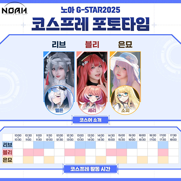 뿐만 아니라 전문 코스프레 팀 RzCOS '블리', '리브', '은묘'가 '노아'의 캐릭터(세리, 펠른, 소피)로 열연하는 코스프레 포토존을 운영할 계획이다.