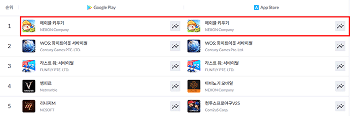 넥슨 신작 모바일 방치형 RPG '메이플 키우기'가 지난 11월 6일 글로벌 정식 출시 후 구글 플레이스토어와 애플 앱스토어 양대 마켓에서 매출 1위에 올랐다.