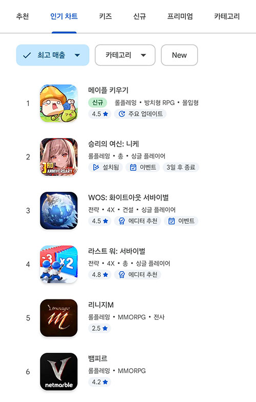 이는, 지난 11월 6일, 일본 앱스토어 마켓 2위, 한국 앱스토어 마켓 1위를 기록한 이후 국내 시장 점유율이 높은 구글 플레이 스토어에서 연달아 달성한 기록이라 더 의미가 깊습니다. 또한, 국내 마켓은 MMORPG가 강세라는 점, 또, 최근 경쟁적으로 공격적인 프로모션을 진행하는 굵직한 MMORPG가 많았다는 점에서도 주목할 만한 성과입니다.