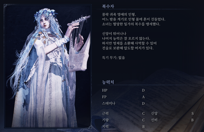 그런데 최근에는 '엘든 링: 밤의 통치자'에 등장하는 클래스 '복수자'가 특대형 무기를 휘두르며 걸걸한 입담을 과시하는 강한 여성 속성으로 주목받으면서 '복쪽이'라는 별명까지 붙으며 급격하게 밈화되고 있습니다. 영체를 부리고 리라를 연주해야 할 가냘픈 소녀가 왜 이런 음해(?)를 당하게 된 것일까요?