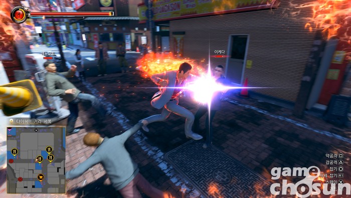 이전 극 시리즈나 원작과 비교하면 콤보 끝에 자연스럽게 피니시 블로가 들어가는 식으로 많이 단순해진 편인데 그렇다고 전투가 단조로운 것은 아닙니다. 방어를 굳힌 적을 무너뜨리거나 찰진 스웨이로 공격을 피하고 반격을 넣는 식으로 꽤나 찰진 손맛을 느낄 수 있습니다. 요컨대 공격 루트의 다양성은 줄어들었지만, 전투 난이도나 접근성은 줄어들었다고 하겠습니다.