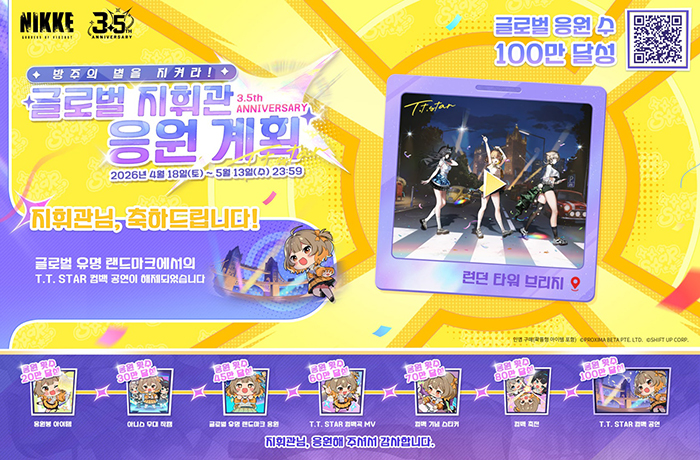 이 같은 파격적인 행보는 게임 속 서사와 완벽하게 맞물려 폭발적인 시너지를 내고 있습니다. 3.5주년 대규모 업데이트로 진행 중인 이벤트 스토리 'STAR ANIS'와 신규 SSR 니케 '아니스: 스타'는 아이돌 그룹 'T.T. STAR'가 과거의 비극적인 사건을 극복하고 마침내 방주의 진정한 별로 거듭난다는 감동적인 서사를 담고 있습니다.