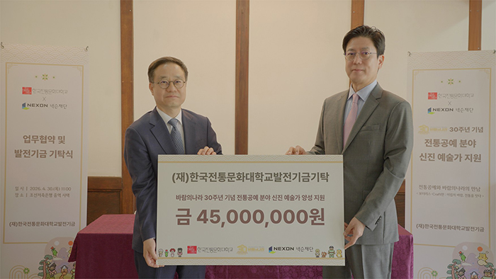 신진 예술가들의 원활한 작업 활동을 위해 넥슨재단은 한국전통문화대학교에 4,500만원의 기부금을 전달했다. 이날 서울 중구 조선저축은행 중역 사택에서 열린 전달식에는 넥슨재단 김정욱 이사장과 한국전통문화대학교 강경환 총장 등 양측 관계자들이 참석해 자리를 빛냈다.