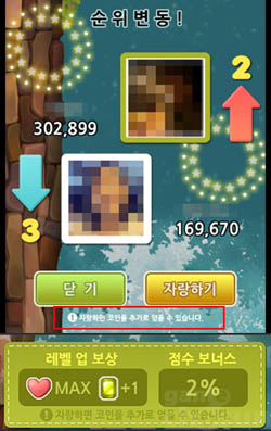 대신 기존 활용도가 낮았던 레벨업이나 최고 점수 달성 시 '친구에게 자랑하기' 기능을 이용하면 추가 게임머니 획득 기능을 제공해 게임을 즐기는 이들을 대상으로 카카오톡 메시지를 주고받도록 해 게이머들이 경쟁에 집중하도록 했다.