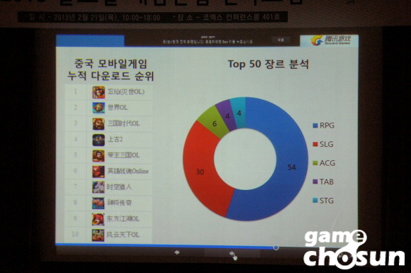 21일 삼성동 코엑스에서 열린 '2013글로벌 게임산업 전략포럼'의 발제자로 나선 텐센트 코리아의 이주옥 전략기획실장은 "중국은 모바일게임 시장은 '게이머'들을 위한 시장"이라며 "현지 모바일게임 누적 다운로드 순위 TOP 50위권을 살펴보면 RPG(54%), 전략시뮬레이션(30%)과 같은 하드코어 장르가 전체의 80% 이상을 차지하고 있다"고 말했다.