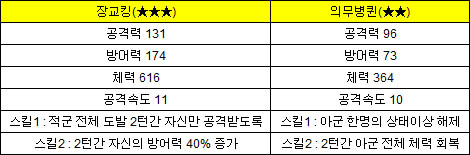그 주인공은 바로 '장교 킹'과 '의무병 퀸'이다. 두 영웅의 능력치는 다음과 같다.