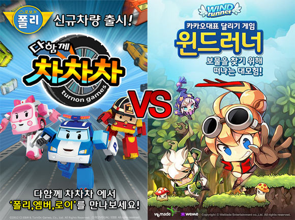 다함께 차차차는 애니메이션 '로보카폴리'에 등장하는 폴리, 로이, 엠버 등 3종의 로보카 차량을 새롭게 추가했고 윈드러너는 신규 캐릭터 '카일리'와 '화산지대' 스테이지를 업데이트했다. 두 게임은 현재 서로 엎지락 뒤치락하며 매출과 순위에서 치열한 경쟁을 하고 있다.