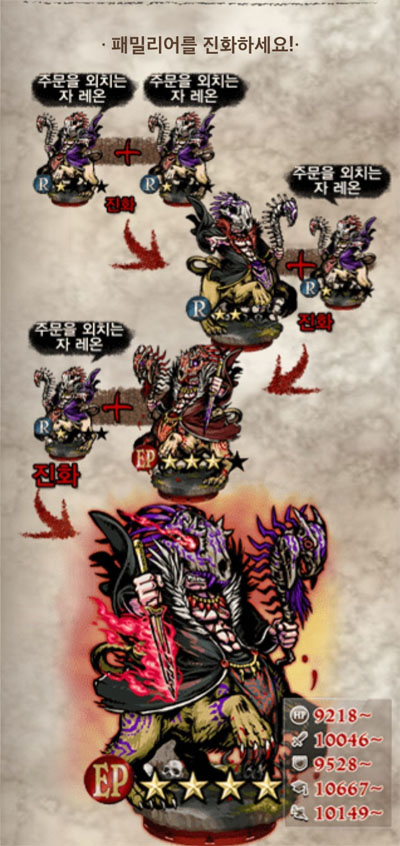 이외에 최종 진화 형태가 EP 등급이라 하더라도 더이상 수집에 자신이 없는 패밀리어는 R★★ 및 EP★★★ 중간 단계부터 진화를 시작하기도 한다. -> (R★★+R★)+R★ / EP★★★+R★