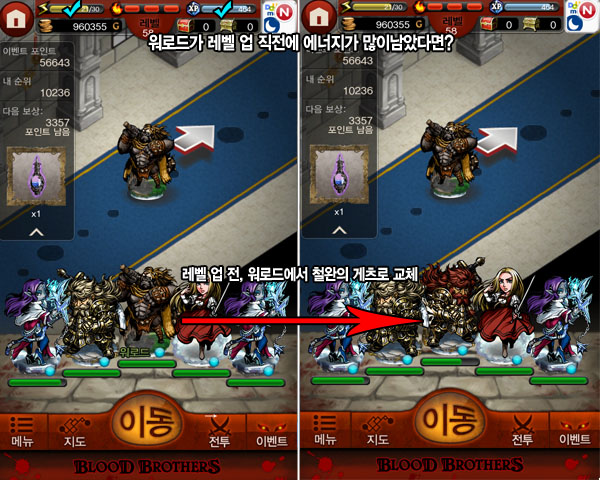 이렇게 에너지를 거의 다 사용하고 난 후 다시 2열로 밀려난 워로드를 선택, 남은 에너지를 사용하여 워로드를 레벨업 시키는 형태로 에너지를 관리하면 같은 시간이라도 훨씬 효율적으로 에너지 사용이 가능하다.