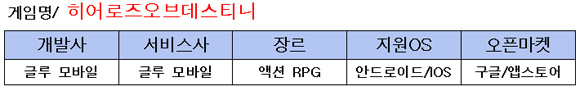 글루 모바일은 신작 ‘히어로즈오브데스티니(Heroes of Destiny)를 앱스토어와 구글마켓에 출시했다고 27일 밝혔다.