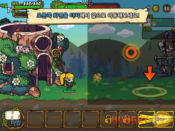 게임 조작법은 최대한 단순화 시킨 모습니다. 화면의 왼쪽을 터치하면 캐릭터가 왼쪽으로 이동하고 오른쪽을 터치하면 오른쪽으로 이동하는 것이 이동 조작법의 전부다. 그리고 전투 중에는 소환 버튼을 누르거나 가끔 스킬을 사용하면 된다.