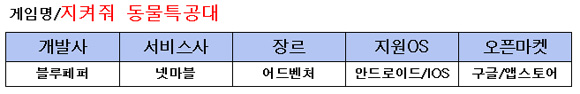 귀여운 전략 어드벤처 게임, 지켜줘 동물특공대가 카카오톡 게임으로 출시됐다. 귀여운 캐릭터와 간편한 조작법, 하지만 겉보기와 다르게 심도깊은 플레이가 가능한 '지켜줘 동물특공대'. 자세히 살펴보자.